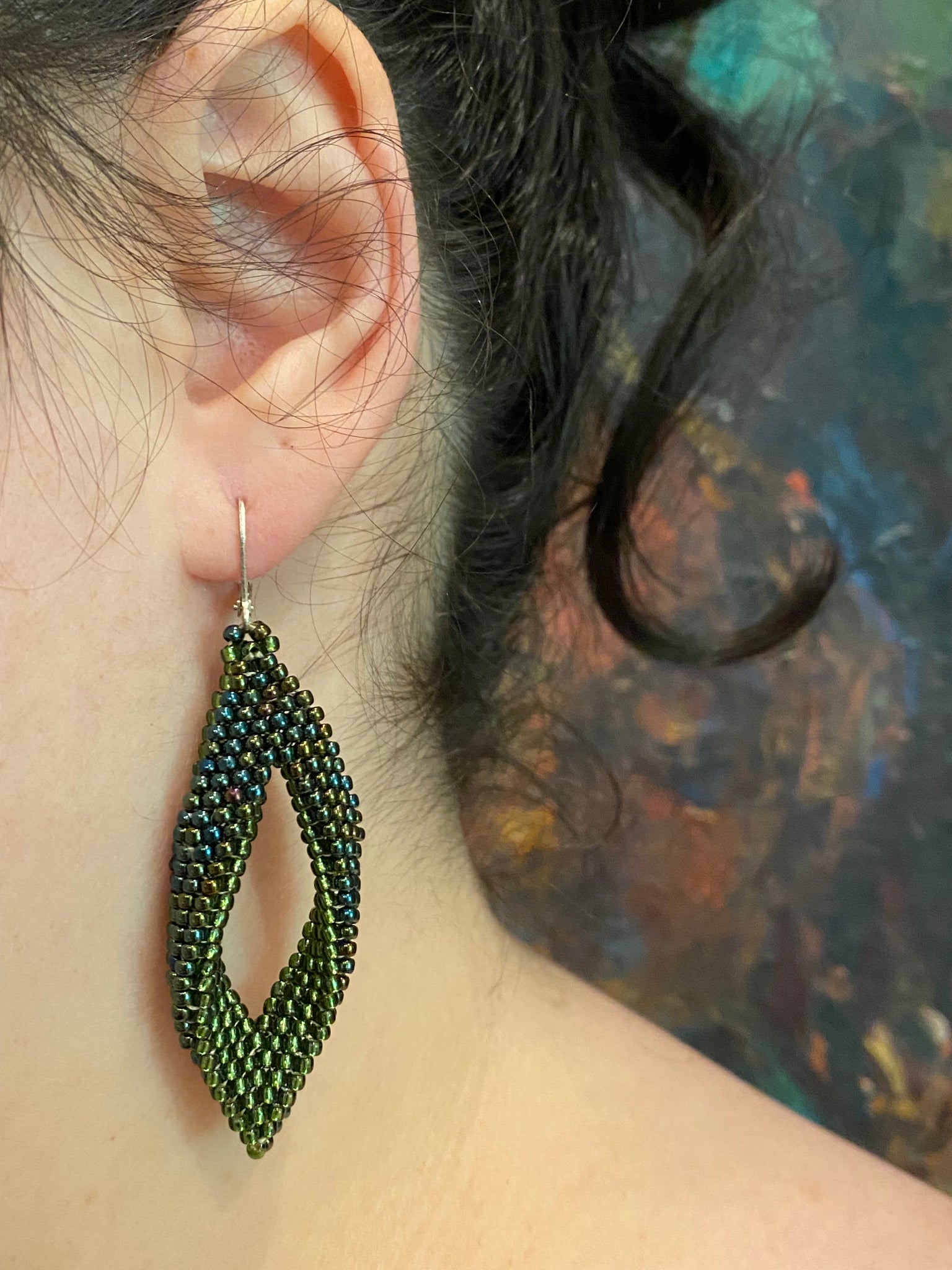 Drop earrings, Metallic Iris Green/Brown and Olive transparent silver lined beads. Wear no matter what the occasion. Silver Lever back earrings.