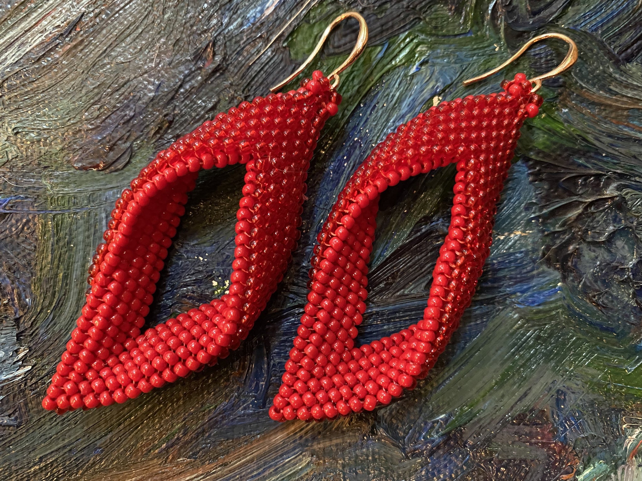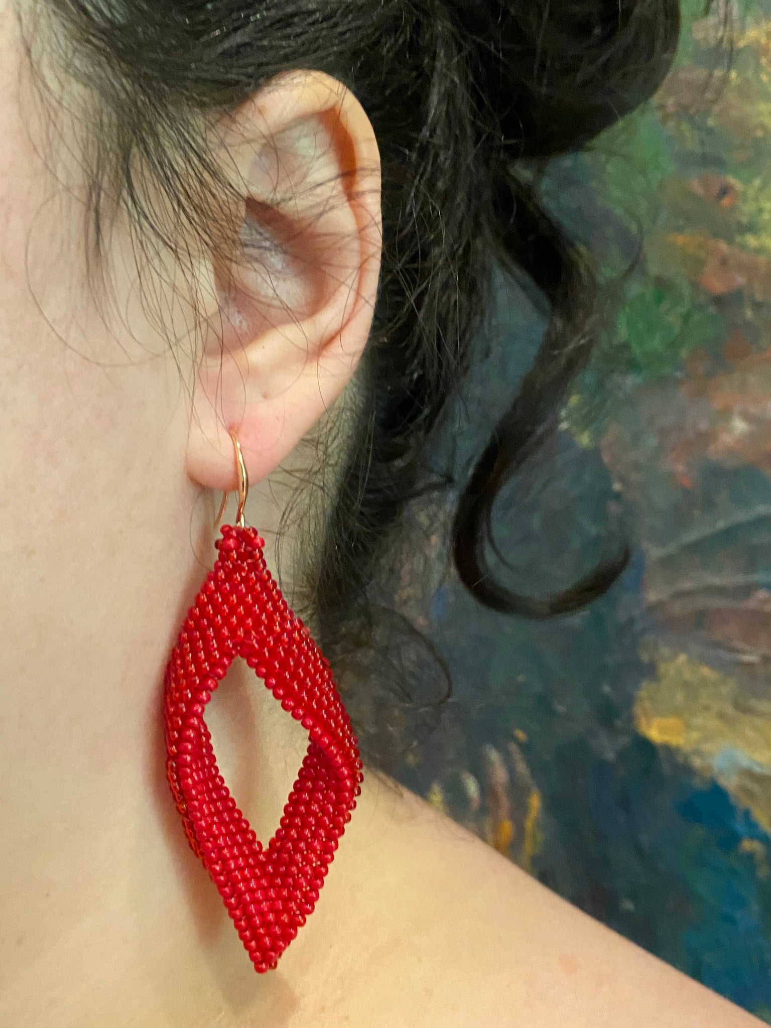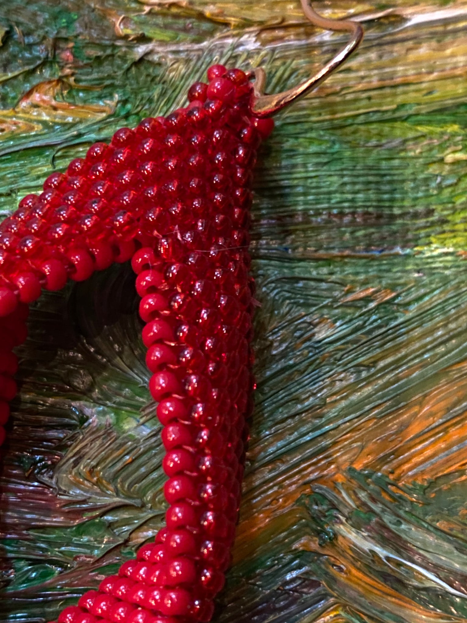 2 1/2" app. long (earring alone, without the earring finding). Smaller earring available in this pattern and color, 2" app. with silver hook (can request rose gold hook)