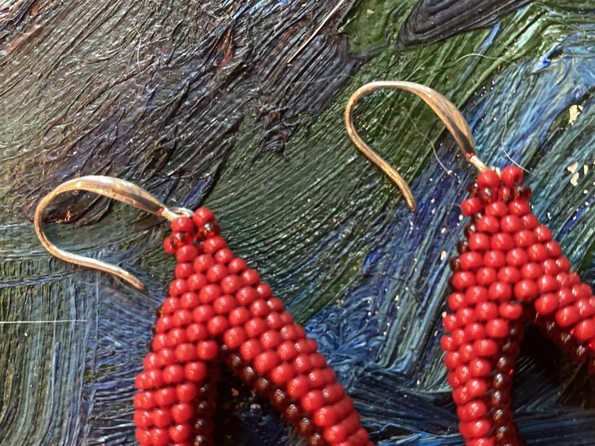 2" app. long (length the earring alone, without the earring finding). Larger earring available in this pattern and color, 2 1/2" app.
