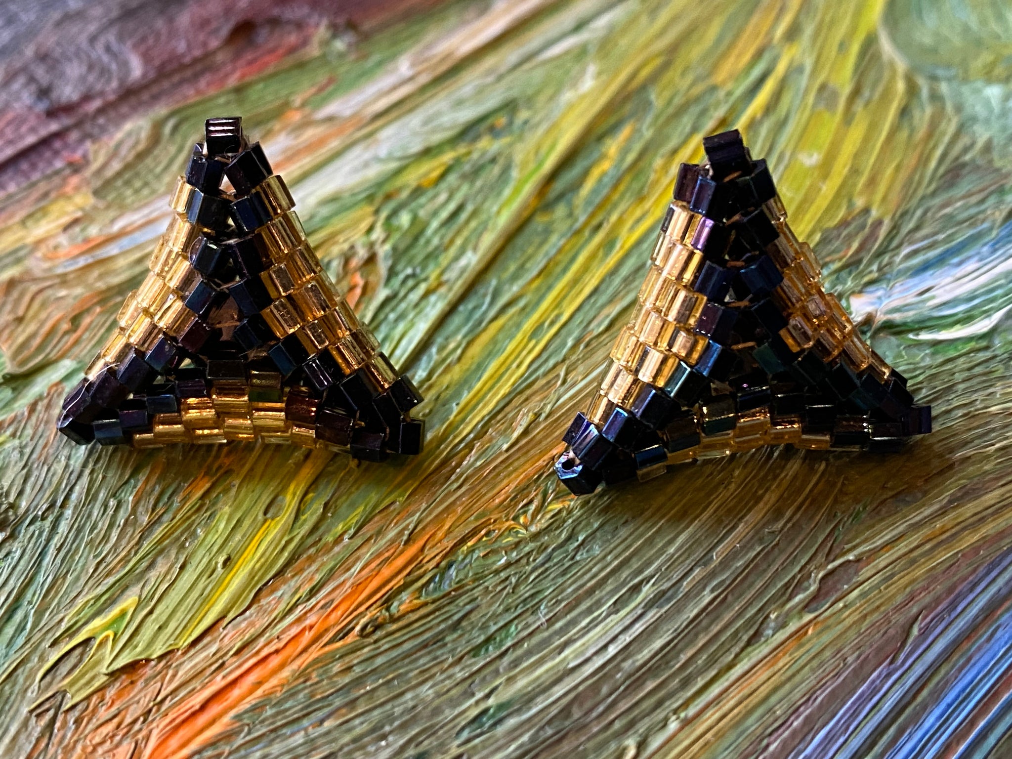 Triangle earrings - Gold and Nebula hexagon beads